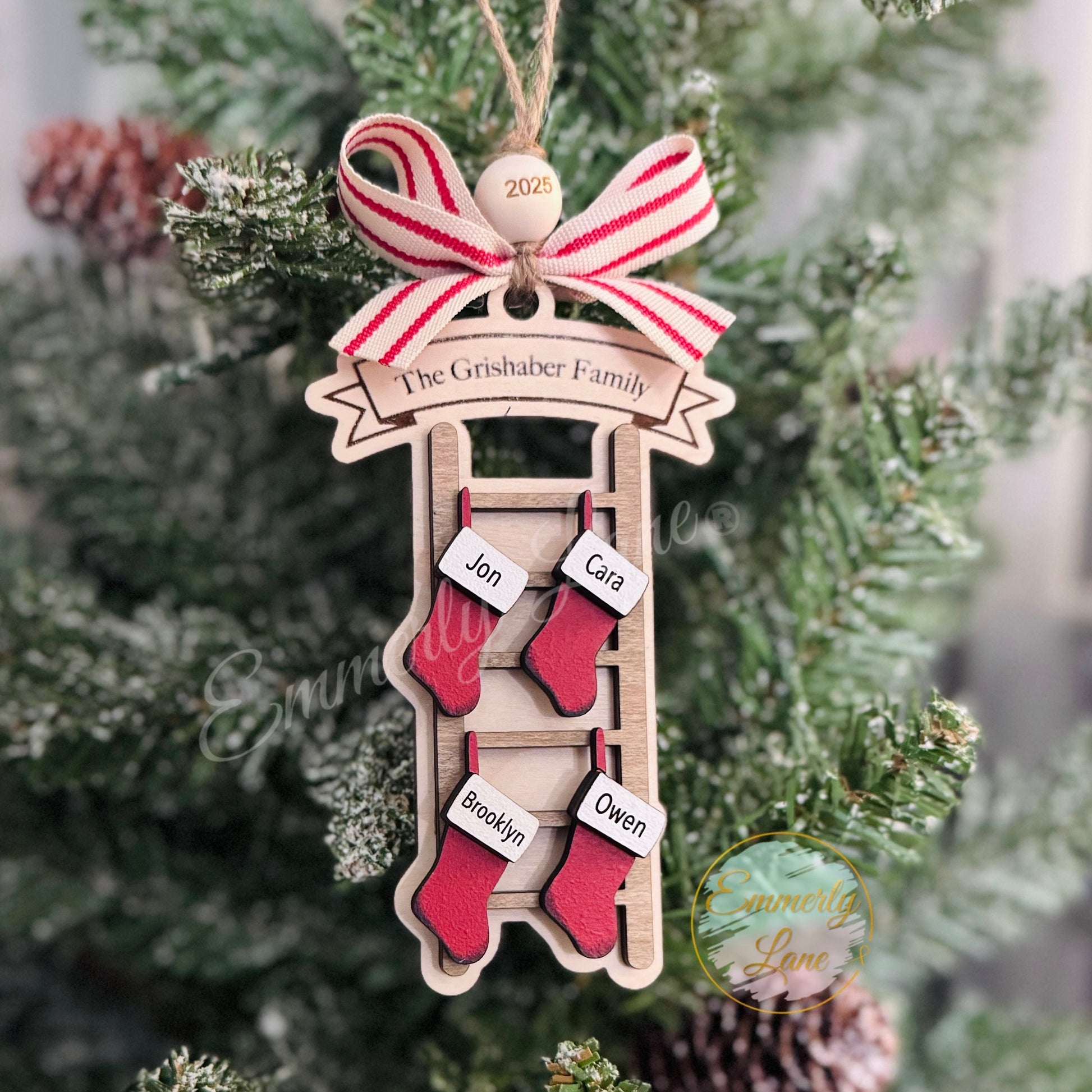 Capture the heartwarming tradition of hanging Christmas stockings with our beautiful Personalized Stocking Ladder Family Ornament! This unique piece is lovingly handcrafted from premium Maple Wood and features miniature stockings, each sweetly personalized with a family member's name.