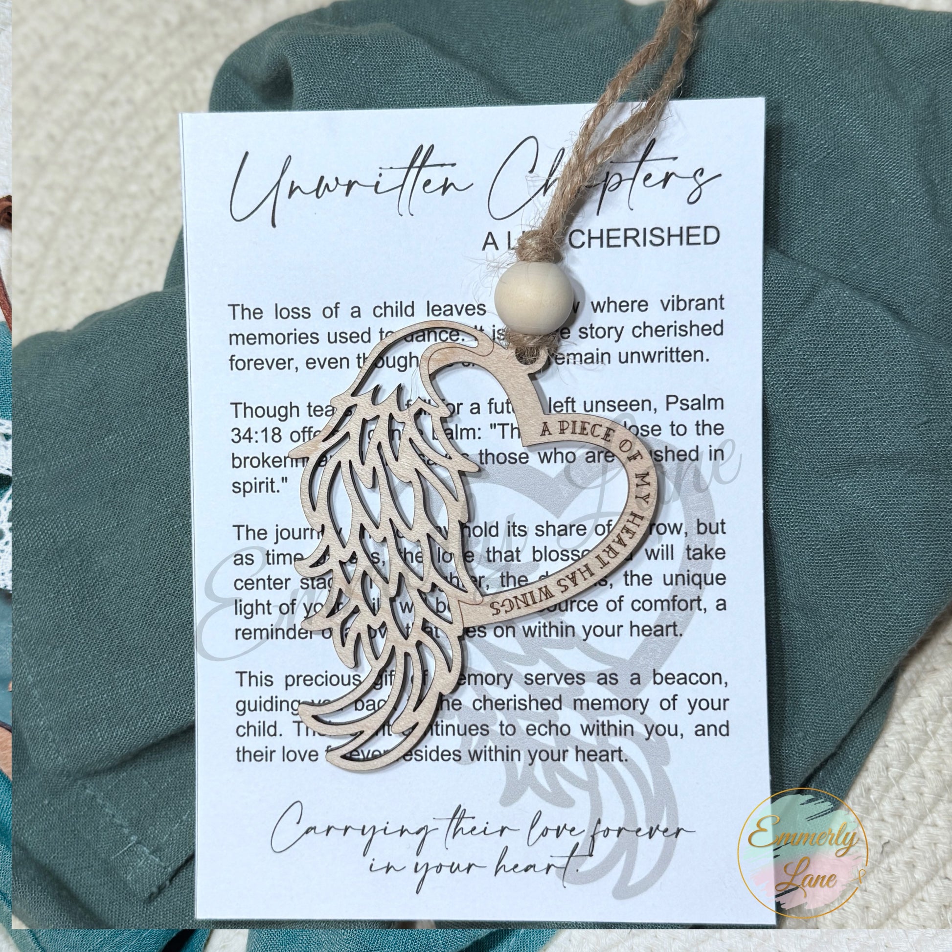 This heartfelt heart ornament is handcrafted from maple plywood. A beautiful way to honor the memory of a loved one, as it symbolizes the everlasting love and memories left behind after the loss of a child and engraved with the saying " a piece of my heart has wings".