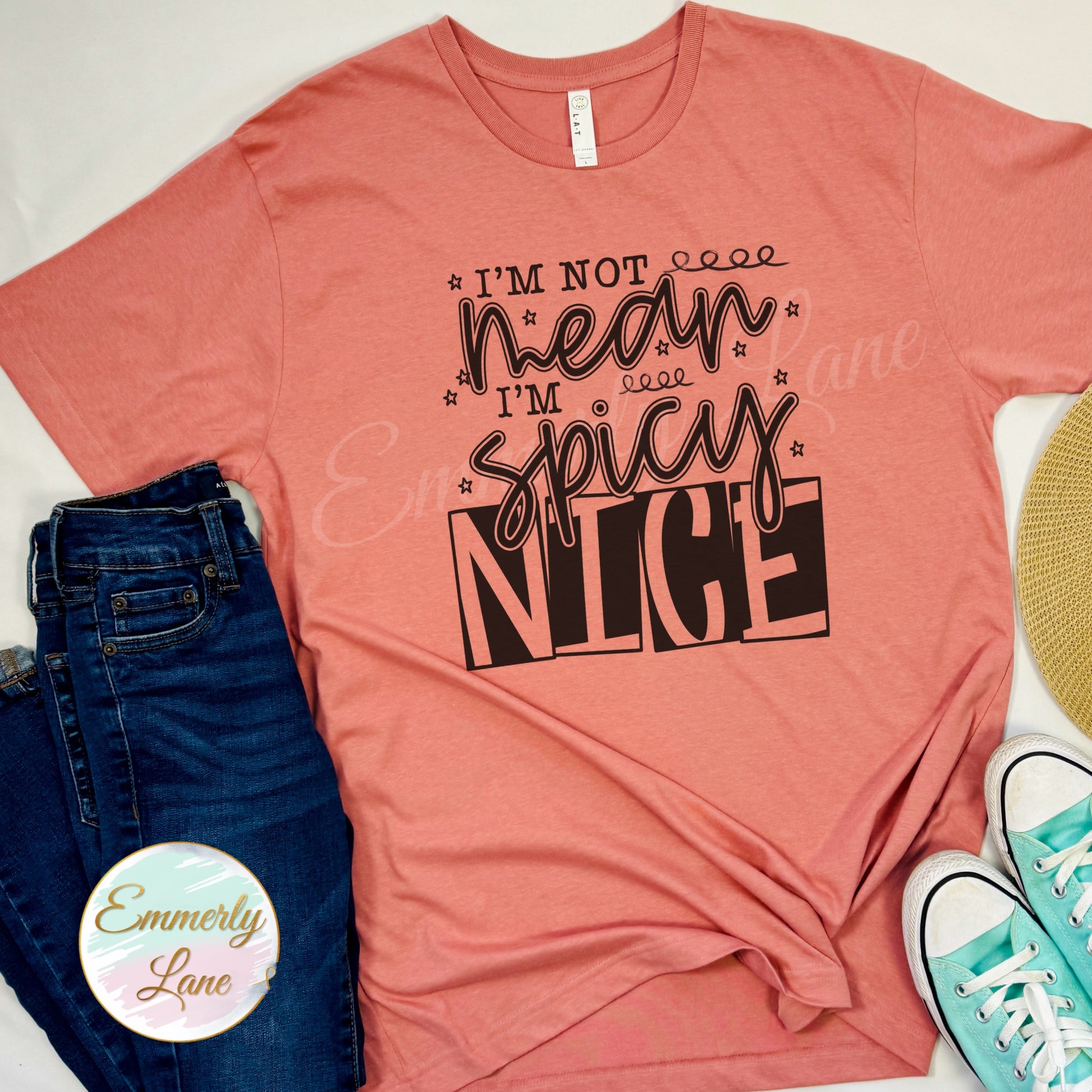 Unleash your sassy side with our "I'm not mean I'm spicy nice" tee featured on our marvelous colored tee.
