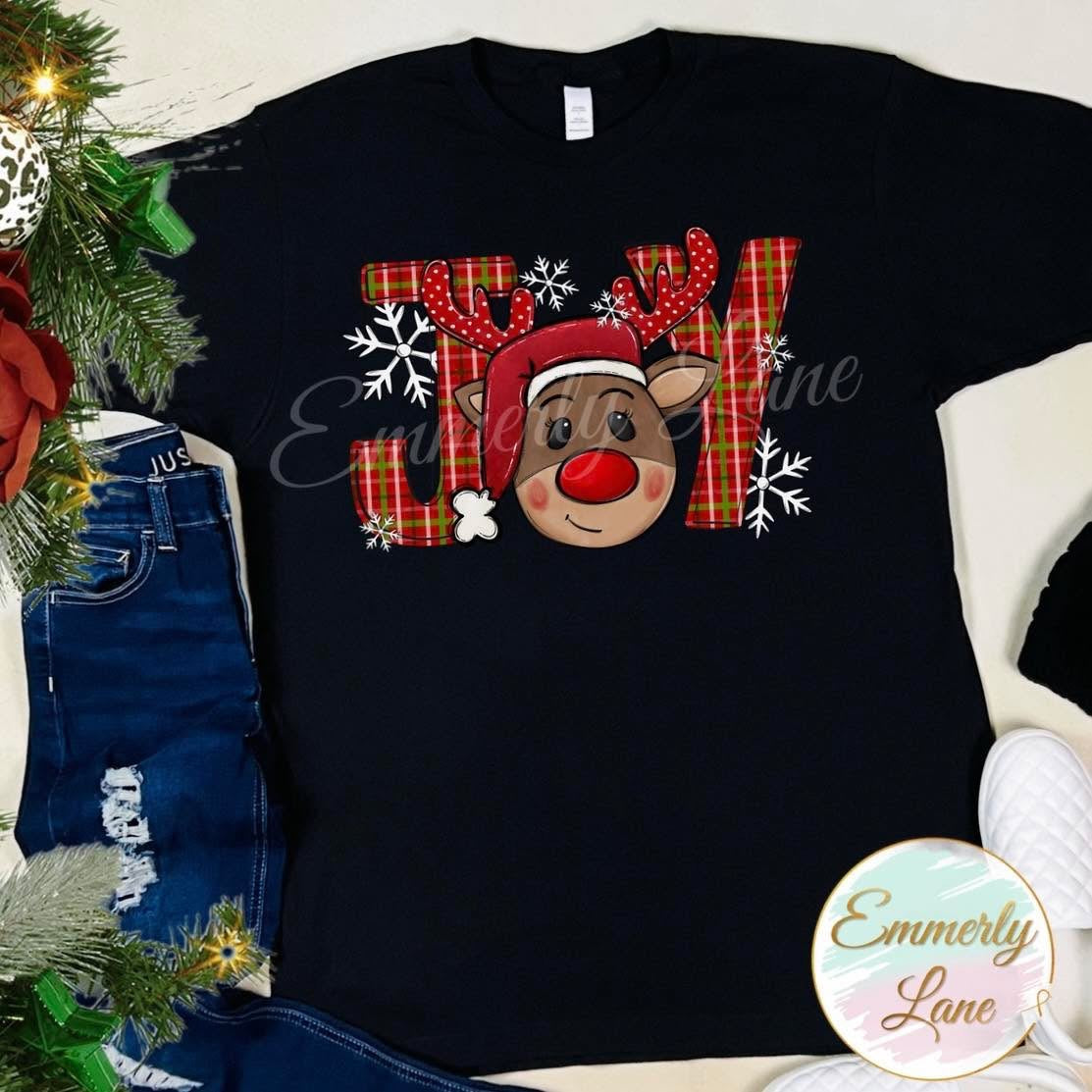 Celebrate the holidays in style with this festive shirt featuring the word "Joy" in bold plaid lettering, complete with a whimsical reindeer design integrated into the "O."