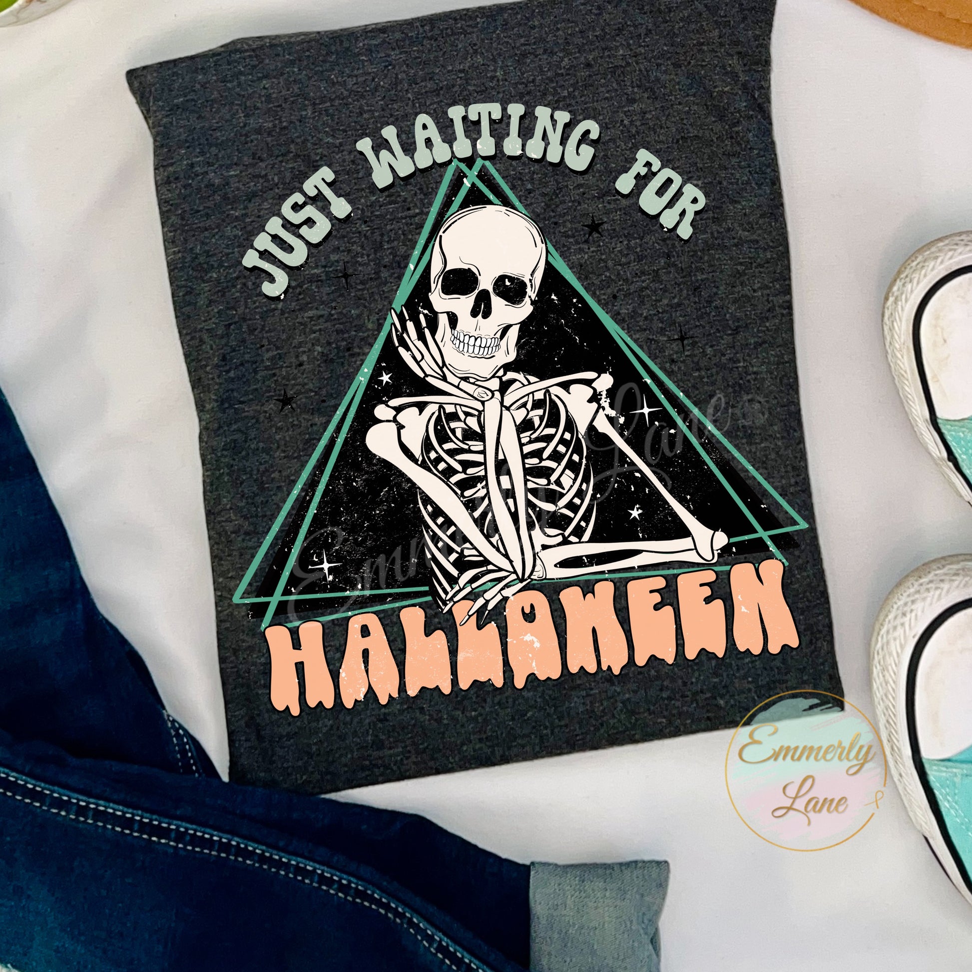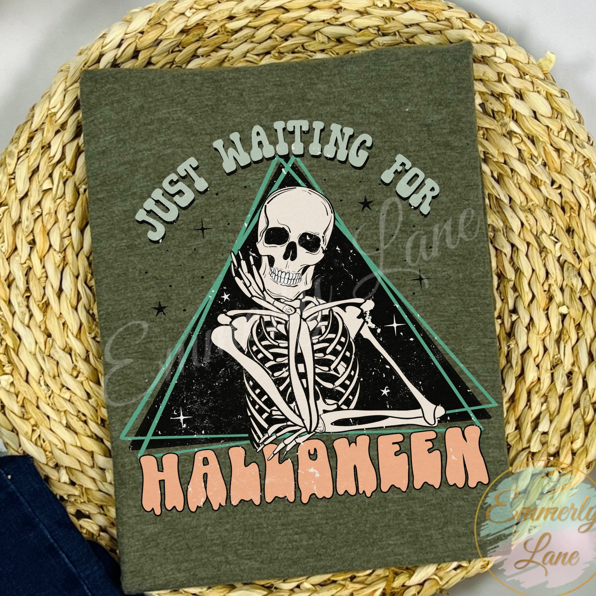 Get Ready for Halloween with this shirt! Show off your love of the holiday with a skeleton that's 'just waiting for Halloween'. A fun and quirky way to get into the spirit of the season! Featured on our heather military green tee and our heather charcoal tee.