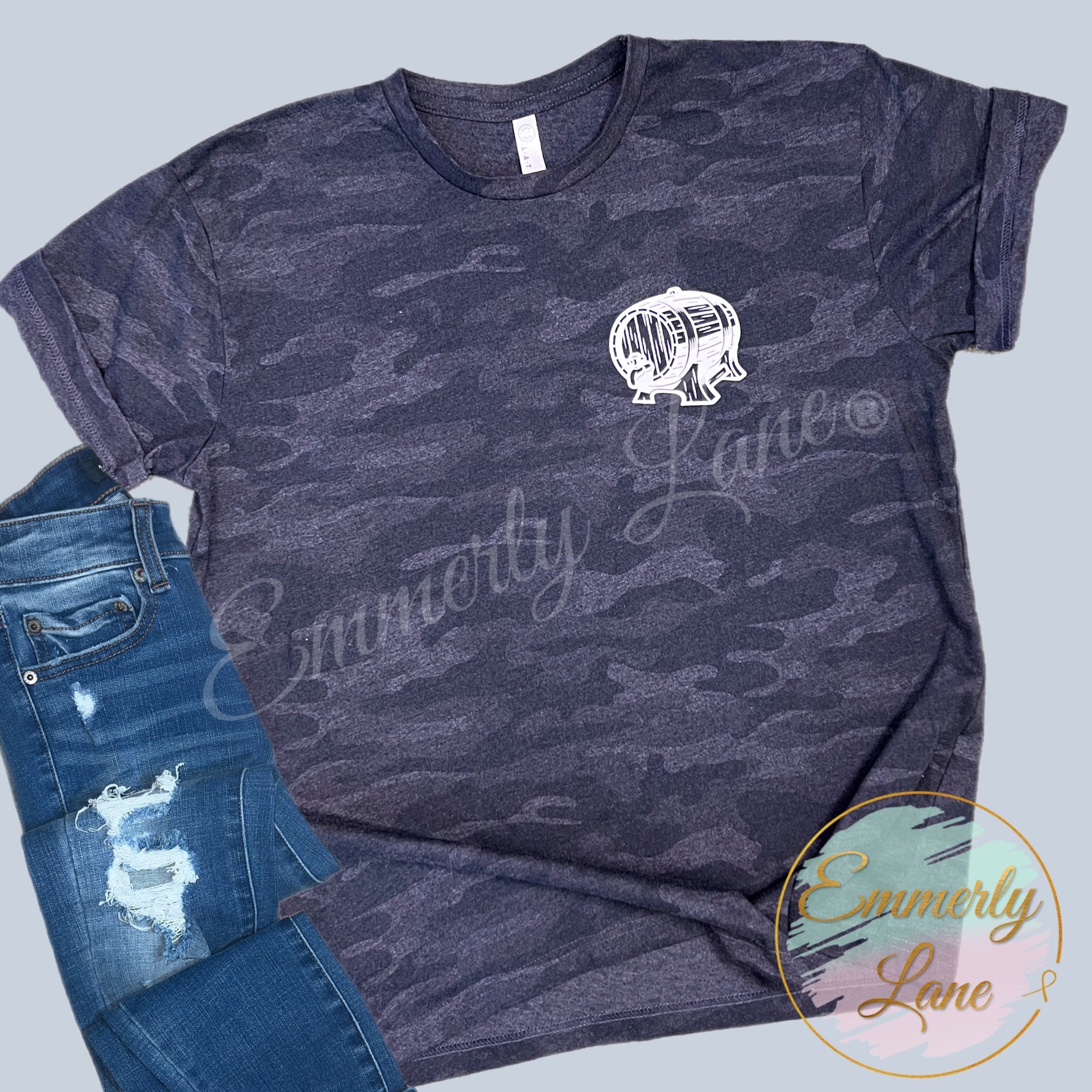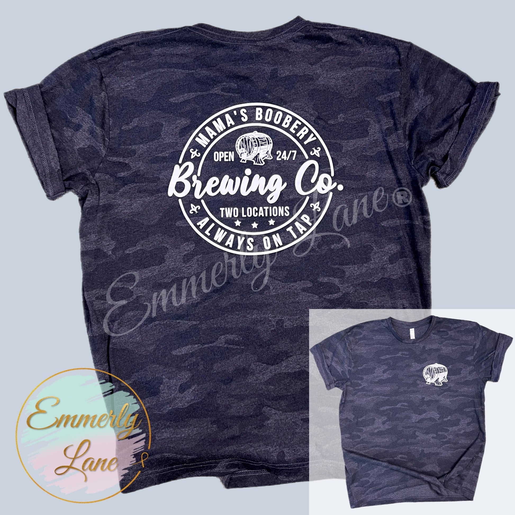Mama’s Boobery Brewing Co. Tee features a front pocket barrel image and back has brewing image.
